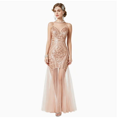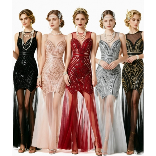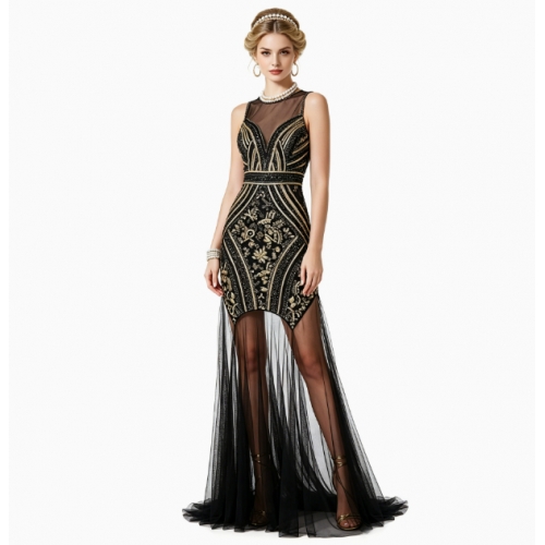 1920s Cross-border Sequined Evening Gown, Long Dress, Retro Plus Size Dress, Beaded Mesh Evening Gown