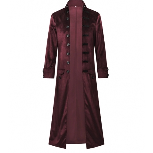 2025 Halloween Men's Overcoat, Solid Color Steampunk Suede Uniform, Long Stand Collar Stage Costume