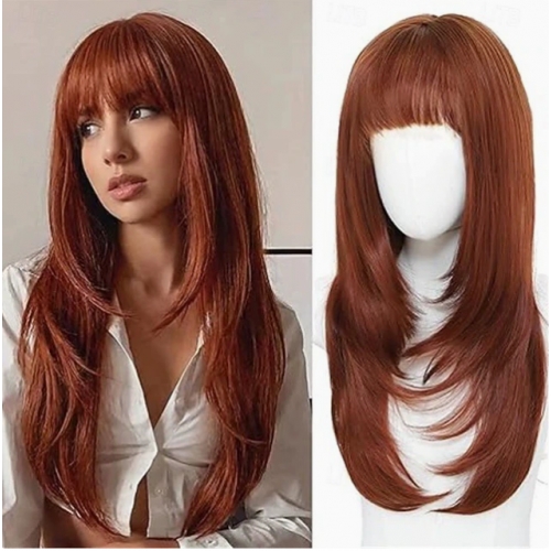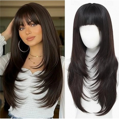 Brown women's bangs wig, wavy brown long wig, 26-inch layered brown wig