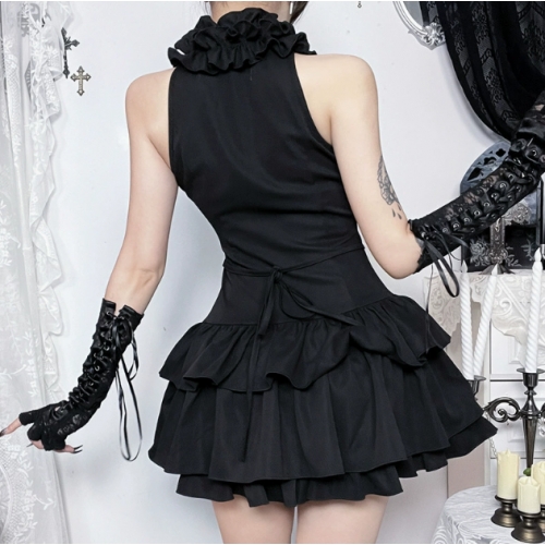Dark retro high-neck sleeveless cake dress, 2026 new gothic style slim-fit punk short skirt for women.