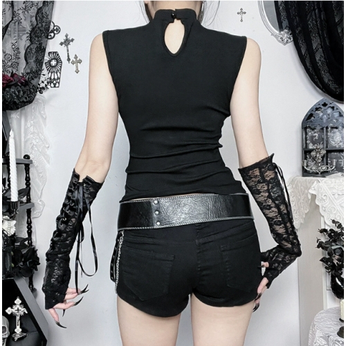 Europe and America dark wind summer new skull net gauze sleeve lace perspective Gothic vest two-piece set