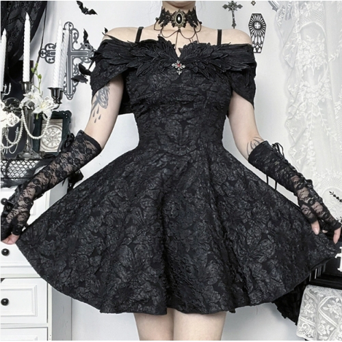 Dark-themed off-shoulder textured dress, 2025 new style, gothic-inspired, unique streetwear, fitted mini dress