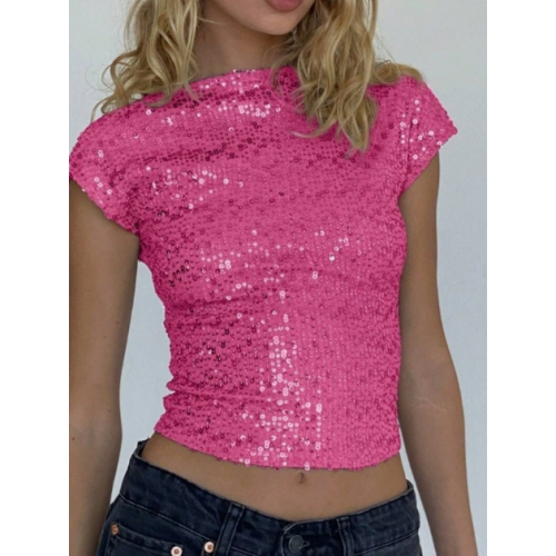 Home > Sequin series > European and American style sparkly T-shirt for women, new summer style, sexy backless sequined round neck short sleeve slim fit top.