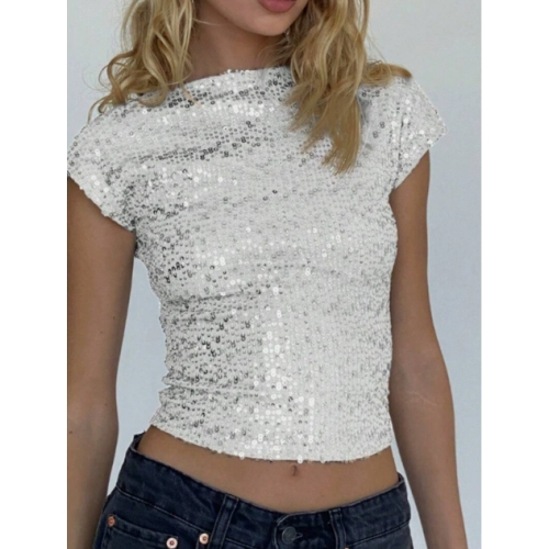 European and American style sparkly T-shirt for women, new summer style, sexy backless sequined round neck short sleeve slim fit top.