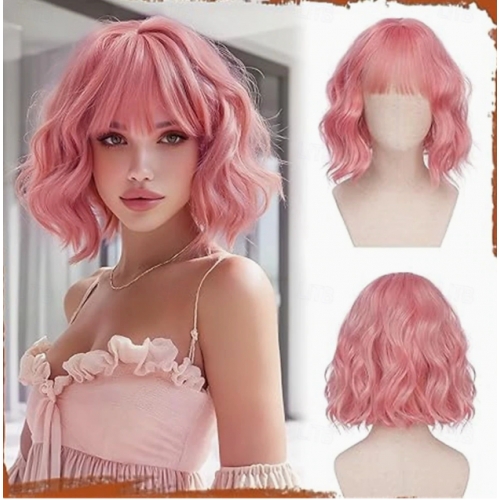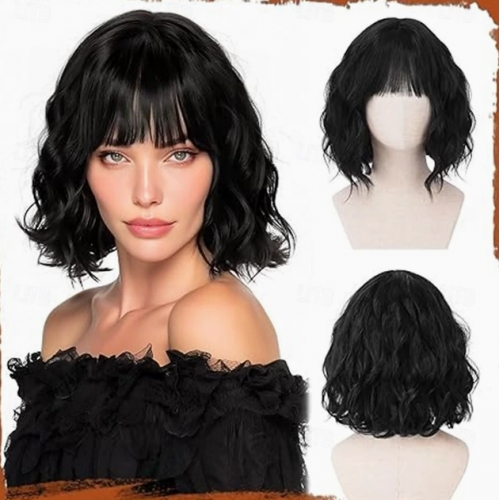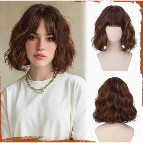 Short wavy golden chestnut brown wig, 12-inch bob with bangs, women's curly shoulder-length bob wig, everyday style.