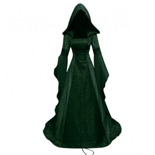 New European and American Medieval Retro Hooded Dress with Square Neck and Flare Sleeves Large Swing Dress